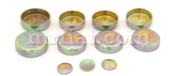 Freeze plug set for Lancia Stratos models. It is galvanized. The engine block contains 8 stamping plugs in 2 sizes and 3 caps.
