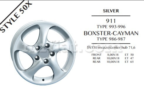 ONE new 8X18 wheel Porsche 911 Type 993 996 models. Wheel Type #: 50X, Bolt Pattern: 5X130 mm, Offset:50 mm, Center Bore: 71.6 mm, Finish: Silver. Includes Center Cap and Logo. Wheels are only sold in a set of 2, you must purchase 2 or 4. Made in Italy.