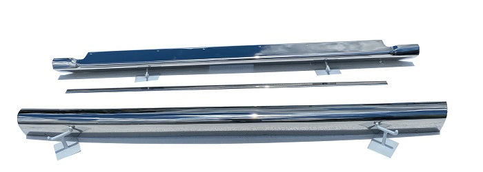 Bumper kit for Range Rover Classic models from 1987-97. It consists of two bumper blades and one metal strip. The metal strip retains the lower seal. The bumpers are stainless steel and hand finished. Stainless steel was chosen for the following reasons: 1 never corrodes rust proof grade 304/ 1.4301 , lifetime anti-corrosion warranty, 2 in case of dent or damage unlike chrome plated steel it does not require stripping and re-chroming, 3 stainless steel allows for easy repair and re-polishing in the hand of a professional, 4 it's a lot tougher than chrome plated grills. The bumpers are finished to a high mirror polish, just like chrome.The back of bumpers are acid etch primed and painted with ICI two pack paint. Delivery takes 2-3 weeks.