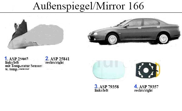 Right replacement glass for exterior mirror for Alfa Romeo 166 models. #4 in corresponding diagram.