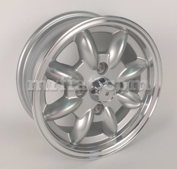 Silver polished 5.5x13 Minilite style wheel for Sunbeam Alpine, Tiger, and Lotus models. Bolt Pattern: 4 x 108 ET 25. Weighs 4.8 kg. Made in Germany.