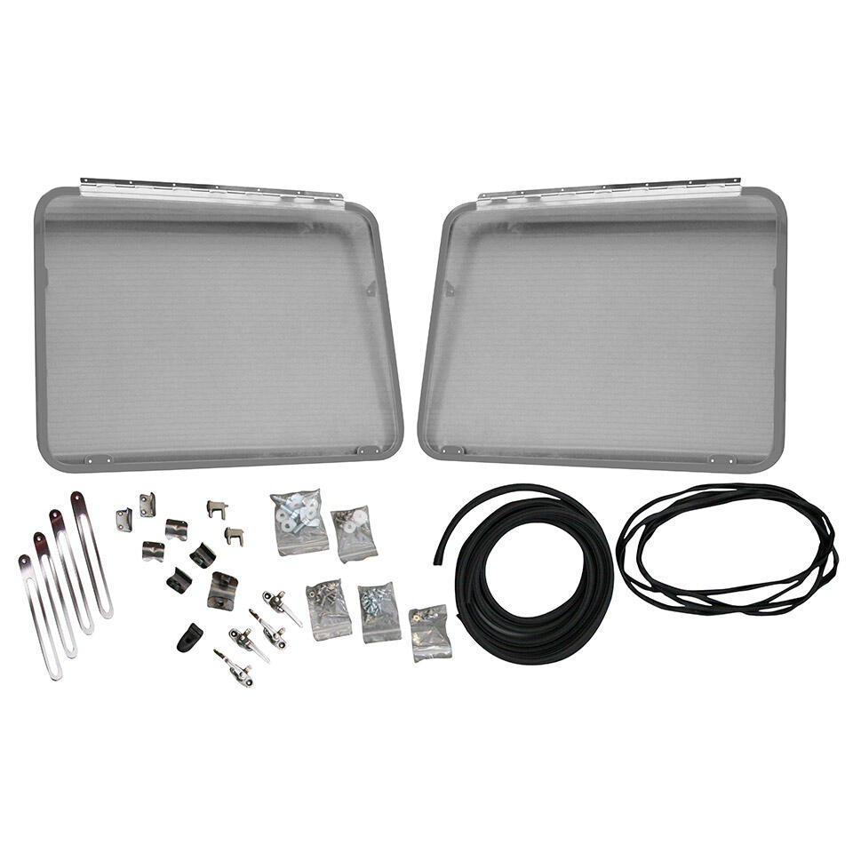 Safari windows, front primered aluminium This top-of-the-line safari window kit contains everything you need to replace your fixed windscreens for Safari windows. Made from strong double walled extruded aluminium for less flex, excately like Volkswagen used to make them.We cannot garantee a 100 watertight operation as Safaris were originally designed for countries with little rain fall, but these are the best safari window kits money can buy. We tested them all. for Bus Brasil, Bus T1 models.